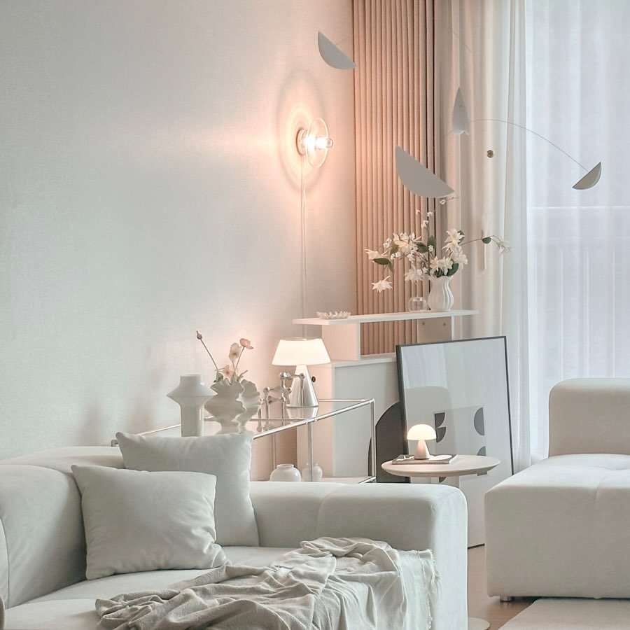 화이트와 아이보리 컬러로 통일된 이 공간은 부드러운 조명과 모빌, 식물로 리듬감을 더했어요.
